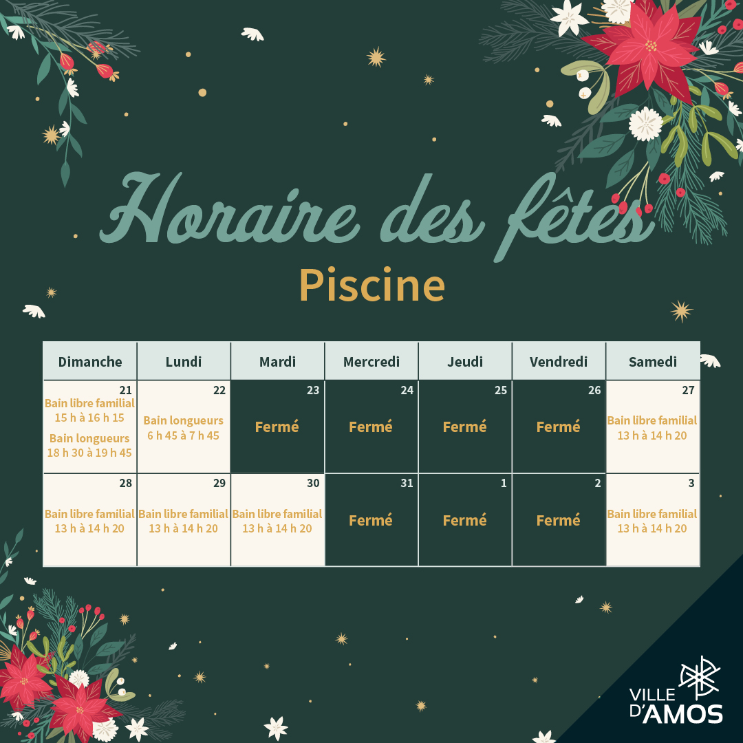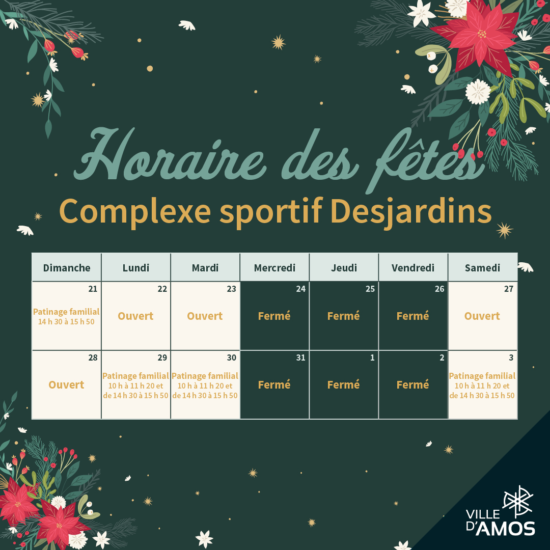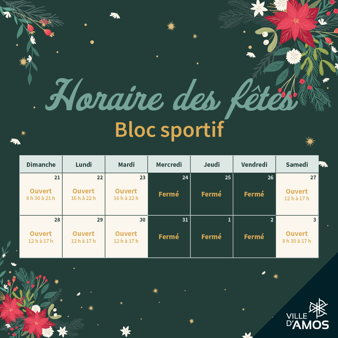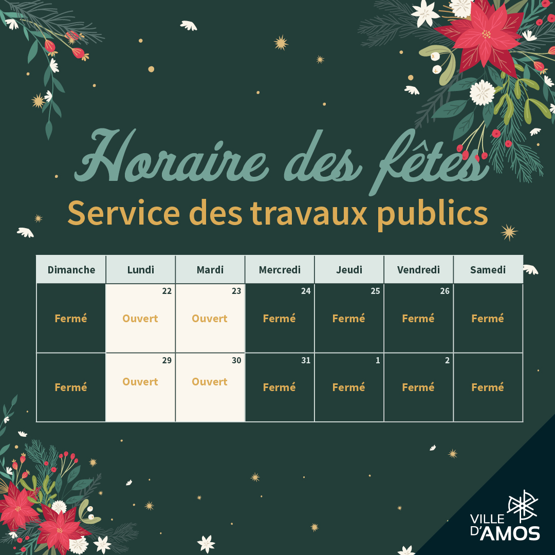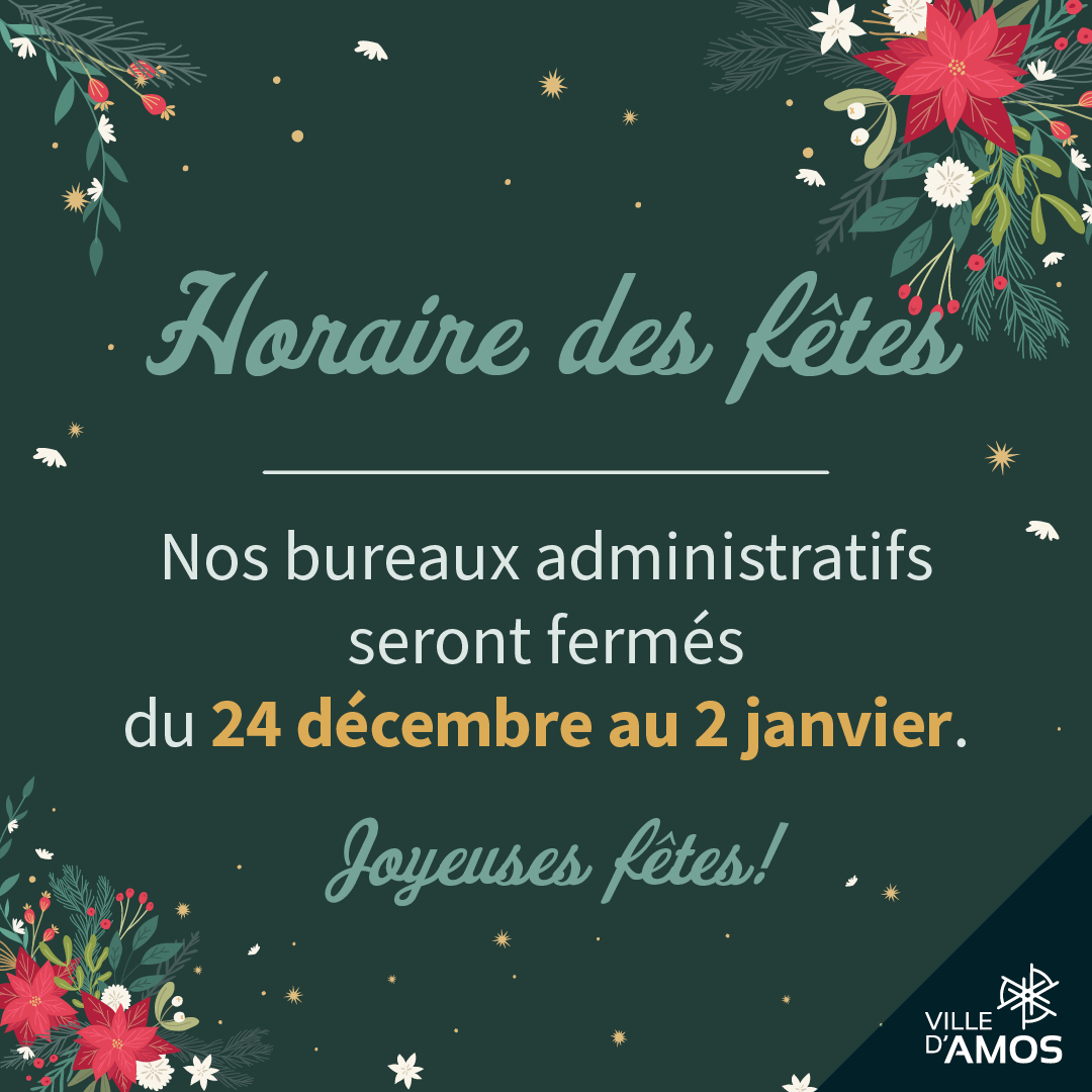 Les heures d’ouverture de nos établissements changeront durant la période des fêtes.