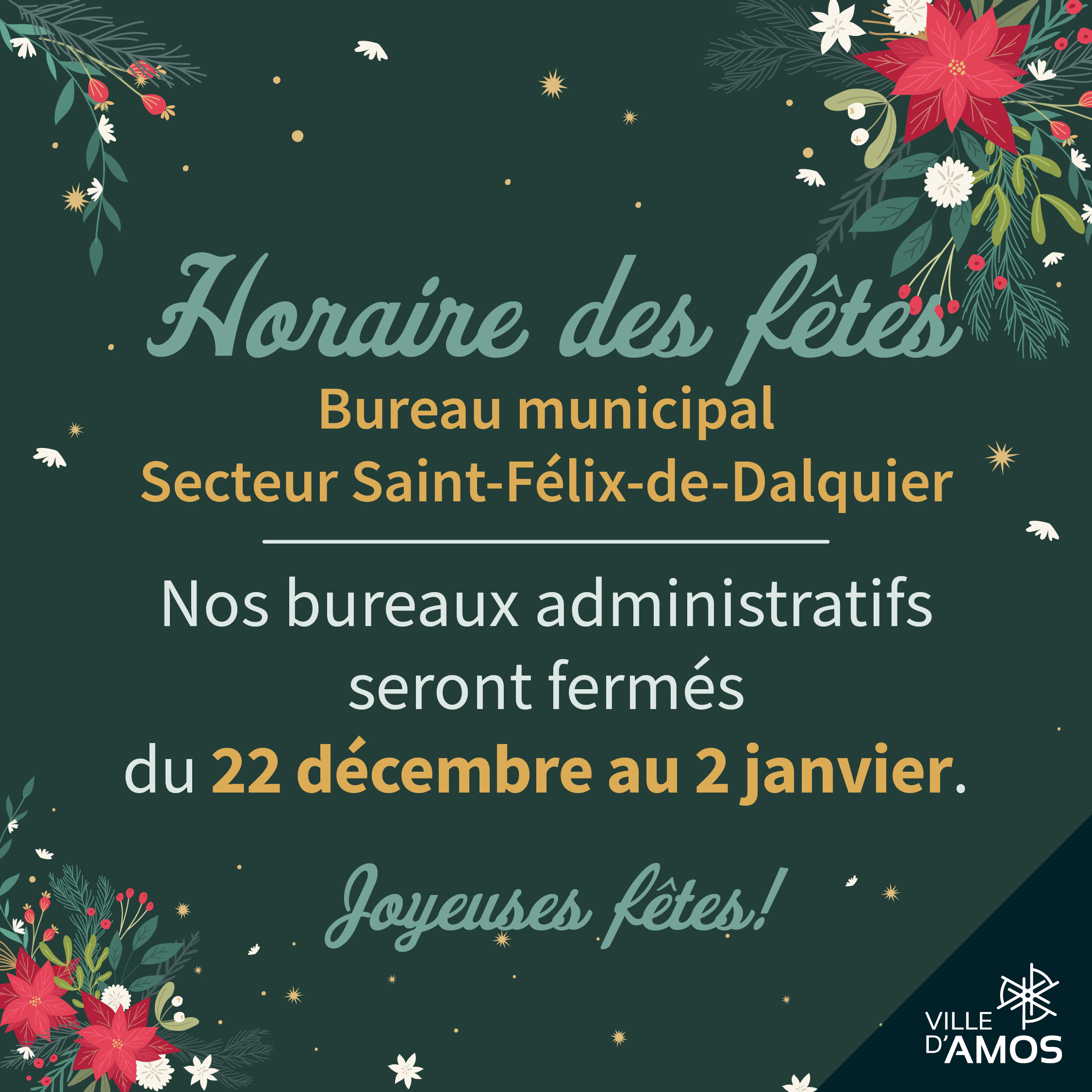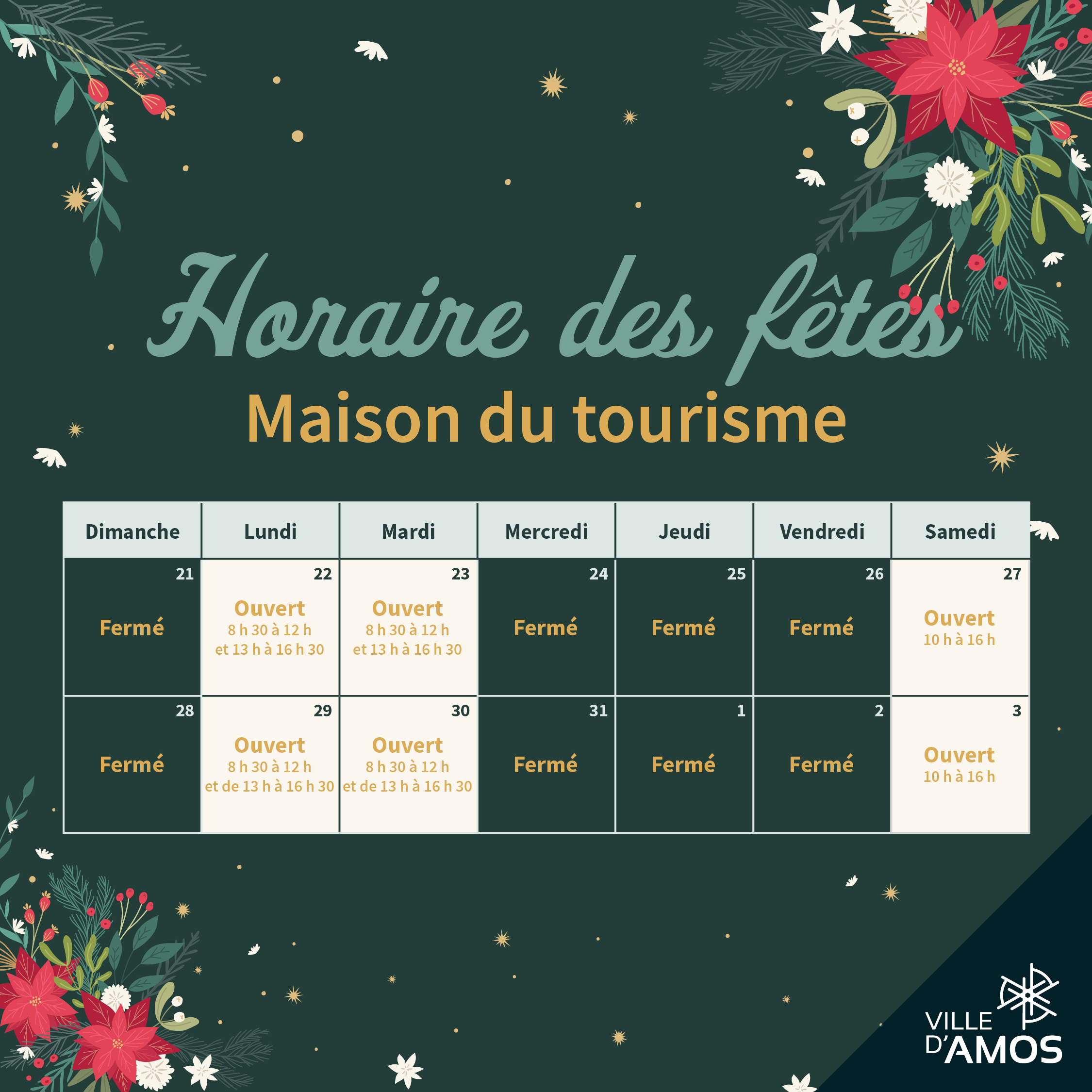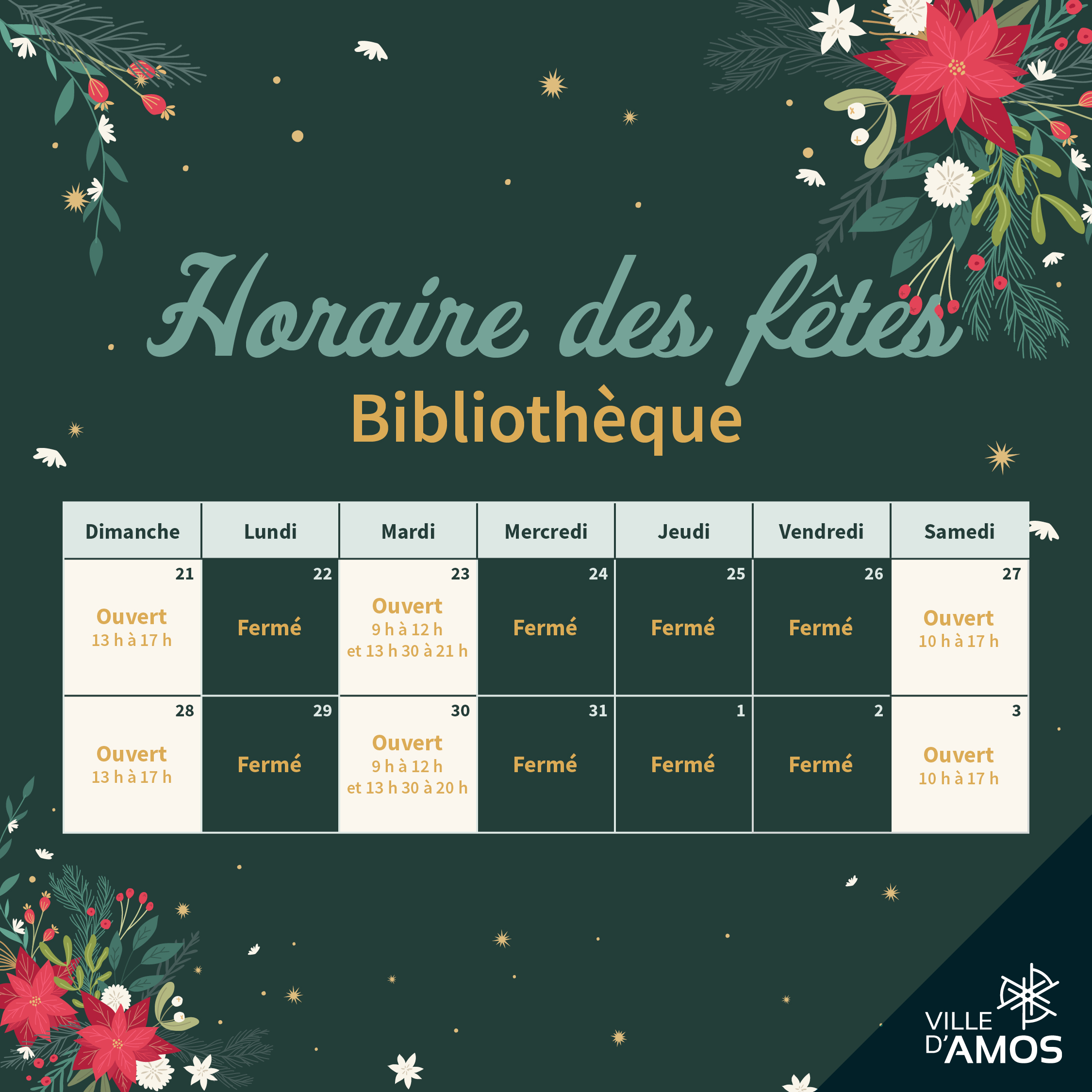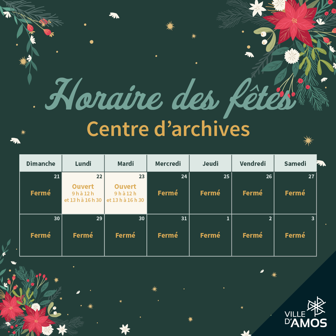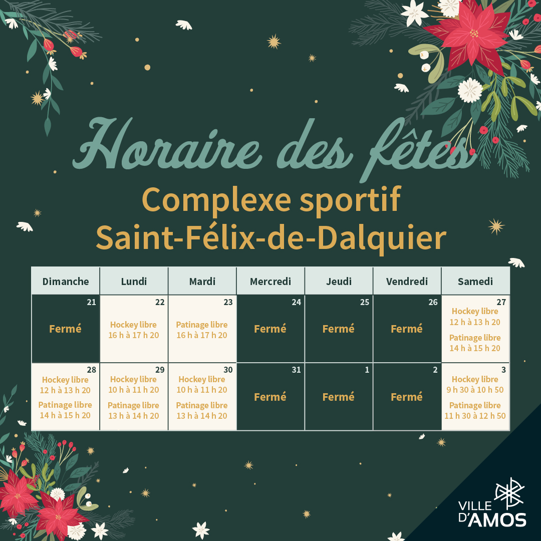 Les heures d’ouverture de nos établissements changeront durant la période des fêtes.