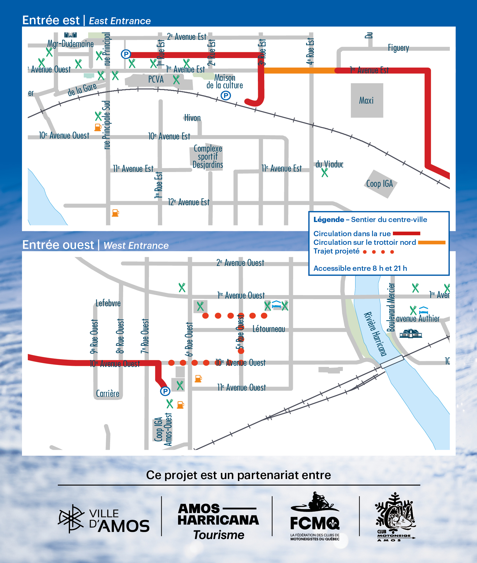 Dès maintenant, les motoneigistes peuvent accéder à Place Centre-Ville d’Amos ainsi qu’à la ruelle située au nord de la 1re Avenue Ouest, et ce, jusqu’au restaurant Toujours Mikes, en respectant les règles prévues par le Code de la sécurité routière et la Loi sur les véhicules hors route.