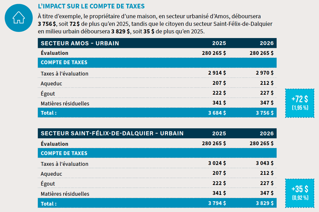 Pour 2026, l’augmentation du taux de taxation pour le secteur urbain d’Amos est fixée à 1,95 %. Cette hausse demeure inférieure à l’Indice des prix à la consommation (2,2 %) et tient compte de la hausse des coûts de construction, tout en limitant l’impact sur les finances des citoyens.