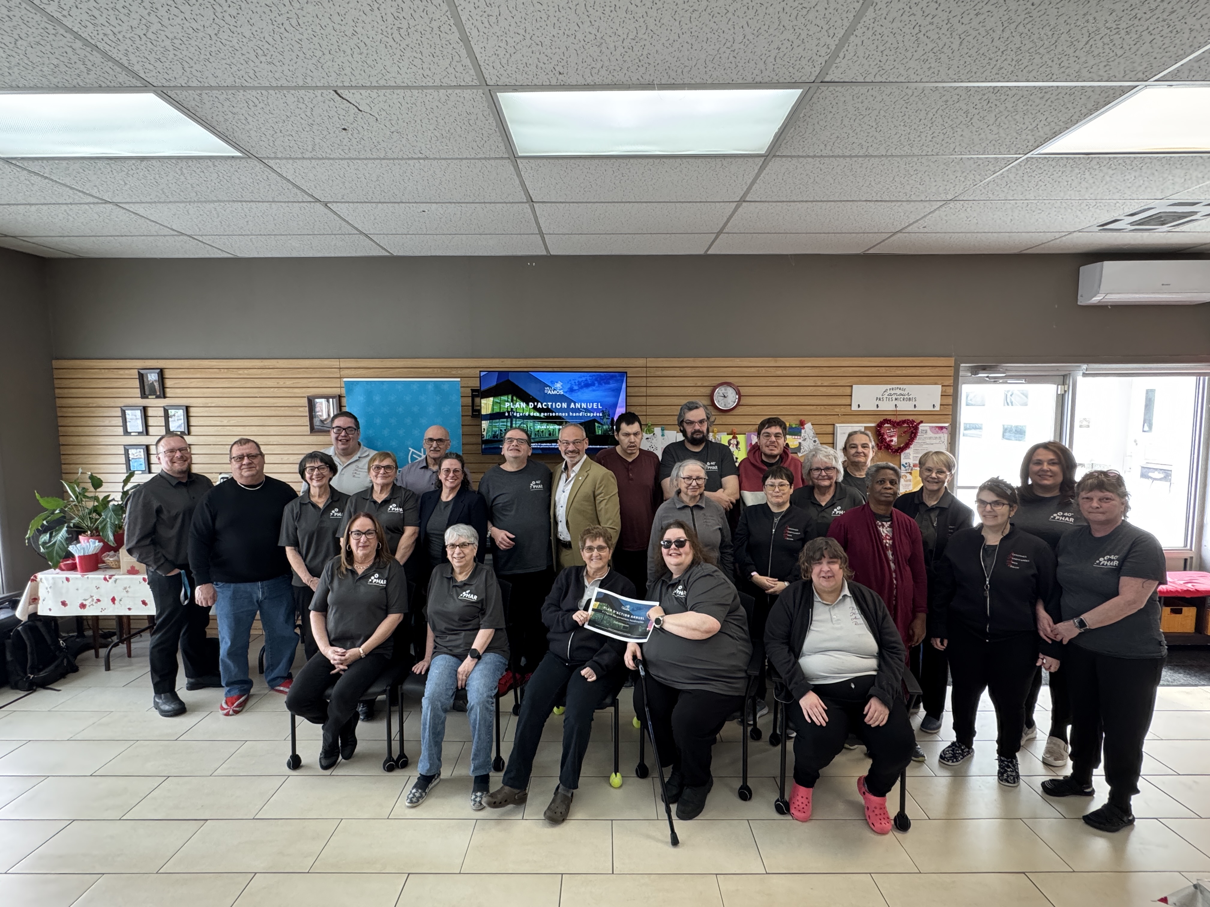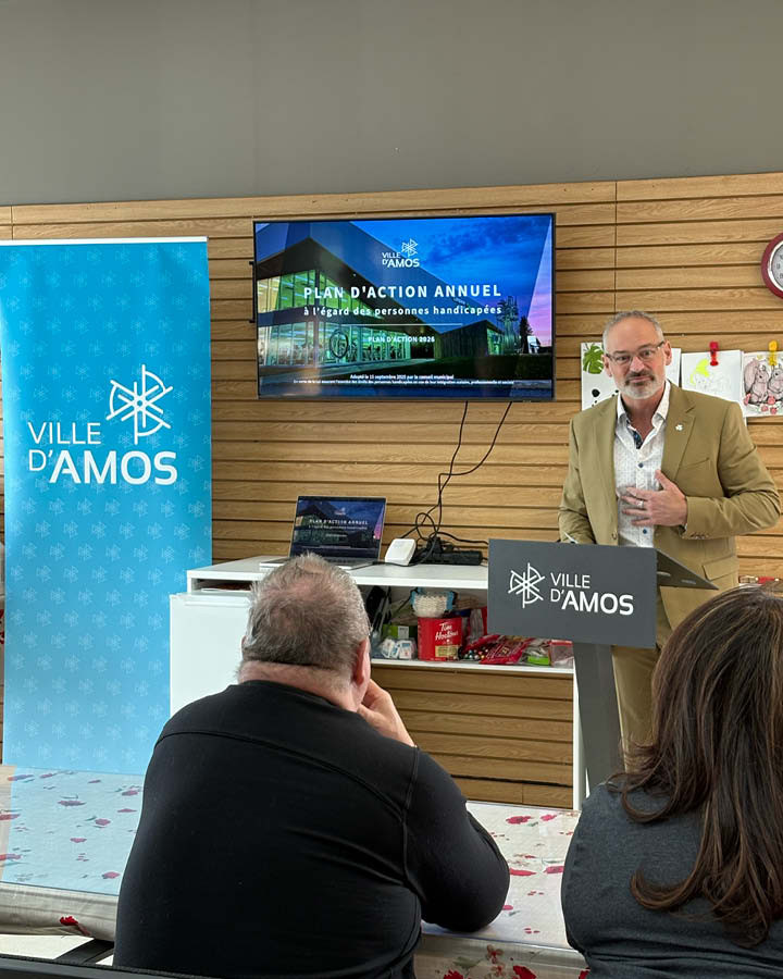 Amos, le 28 janvier 2026. — La Ville d’Amos a procédé aujourd’hui au dévoilement de son premier plan d’action annuel à l’égard des personnes handicapées, une étape marquante qui témoigne de sa volonté de favoriser l’accessibilité, l’inclusion et la participation sociale de toutes et de tous. L'événement s'est déroulé dans les locaux du PHAR devant une trentaine d'usagers et d'invités.